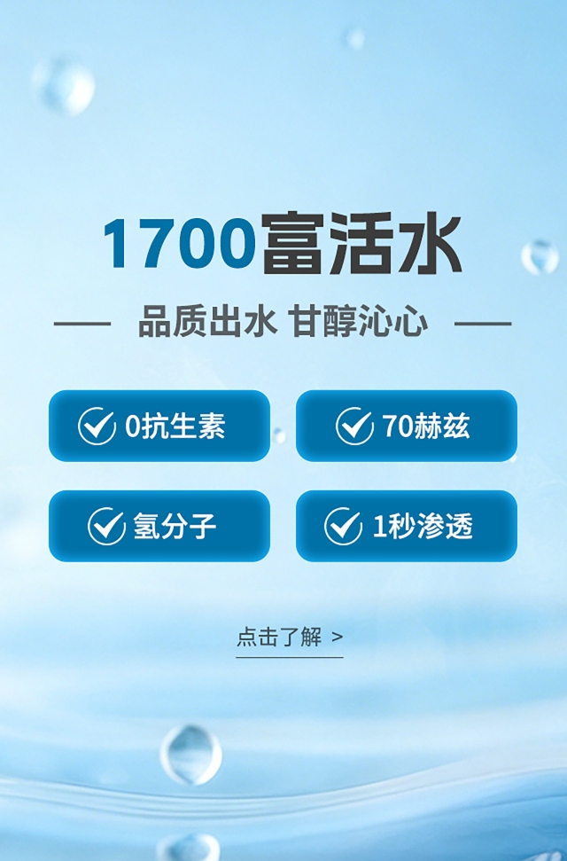 制出的1700富活水,拥有未检出抗生素、70赫兹、H分子、快速渗入的核心特质,水质呈现弱碱性(PH8.5左右)、富氢(约 2000ppb,氢气纯度 99.99%)、富氧(≥5mg / 升)、负电位值(-600 — -300V)等多元理化属性,同时富含 15 种以上矿物质及微量元素(钙、镁、硒、铬、锌、锶、钾等),并含偏硅酸,同时采用低频技术打造品质水质,呈现良好渗透表现,口感甘甜绵柔,商务接待时递上一杯好水,彰显企业品味与品质追求;让员工日常畅饮,尽享清甜柔润的饮用体验。